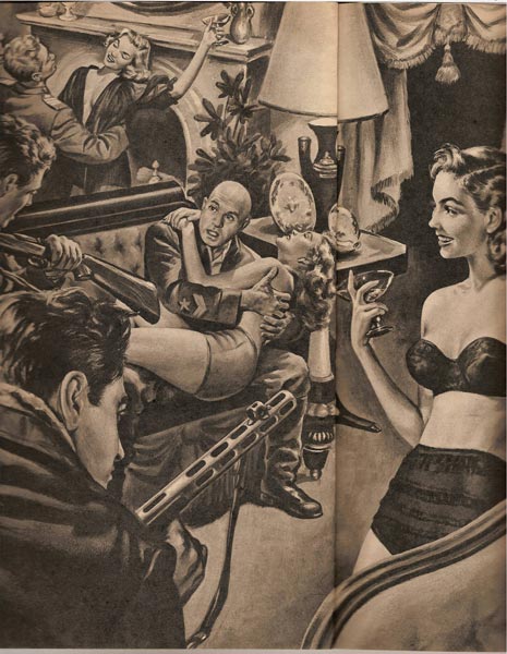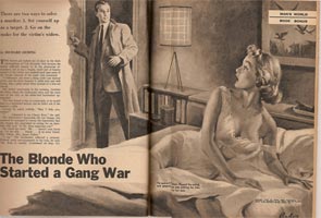 I bought the men's adventure magazines that follow from American Art Archives and other eBay back issue magazine sellers. MAN'S WORLD (June 1958) includes “The Blonde Who Started a Gang War” by Richard Deming, highlighted by this memorable Paul Rader illustration: