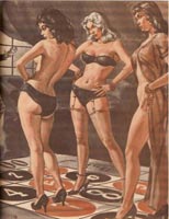 None of the illustrations for the August 1959 issue of MAN'S LIFE are credited, but I believe “The Gambling Madam and her Strange House of Chance” is illustrated by Rader, established as a MAN'S LIFE illustrator with his credit in their Feb 1959 issue. The middle woman of the three in the illustration is a match for a figure in Paul Rader's paperback art for 21 GAY STREET, Midwood 55 (1960). The art department at Midwood cropped off her feet, but when Rader recycled the art for Beeline 235, FORBIDDEN WOMEN, his entire painting was shown, and her feet match this MAN'S LIFE illustration. (For comparison, Rader's cover for Beeline 235 from my Rader checklist is shown here next to the MAN'S LIFE illustration.)