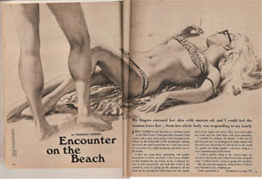 In 1967, MAN'S tried a short-lived men's mag called WAR. Rader's Midwood 41 art, previously reused for GUY December 1963, appears here again for the story “Fannie Mae”.(not shown) Although neither one is credited, Paul Rader recycled two of his Midwood covers for the January 1968 issue of MAN'S. “Gringos – 24 Hours in a Mexican Sintown” reuses Midwood F163, THE DRIFTER. “Encounter on the Beach” recycles the bottom half of Midwood 32-465, PAGAN SUMMER by Dallas Mayo. Rader has worked a neat trick here, for PAGAN SUMMER is a lesbian story. By cutting off all but the lower legs of the woman standing over the bikinied blonde, he has now illustrated this story about a man and woman meeting on a beach. For all we can tell it could be a man standing there, and in MAN'S world, unlike Midwood's , it is a male.