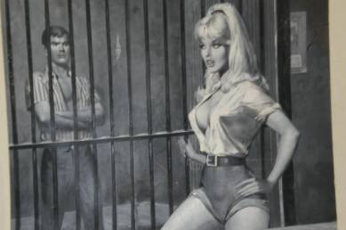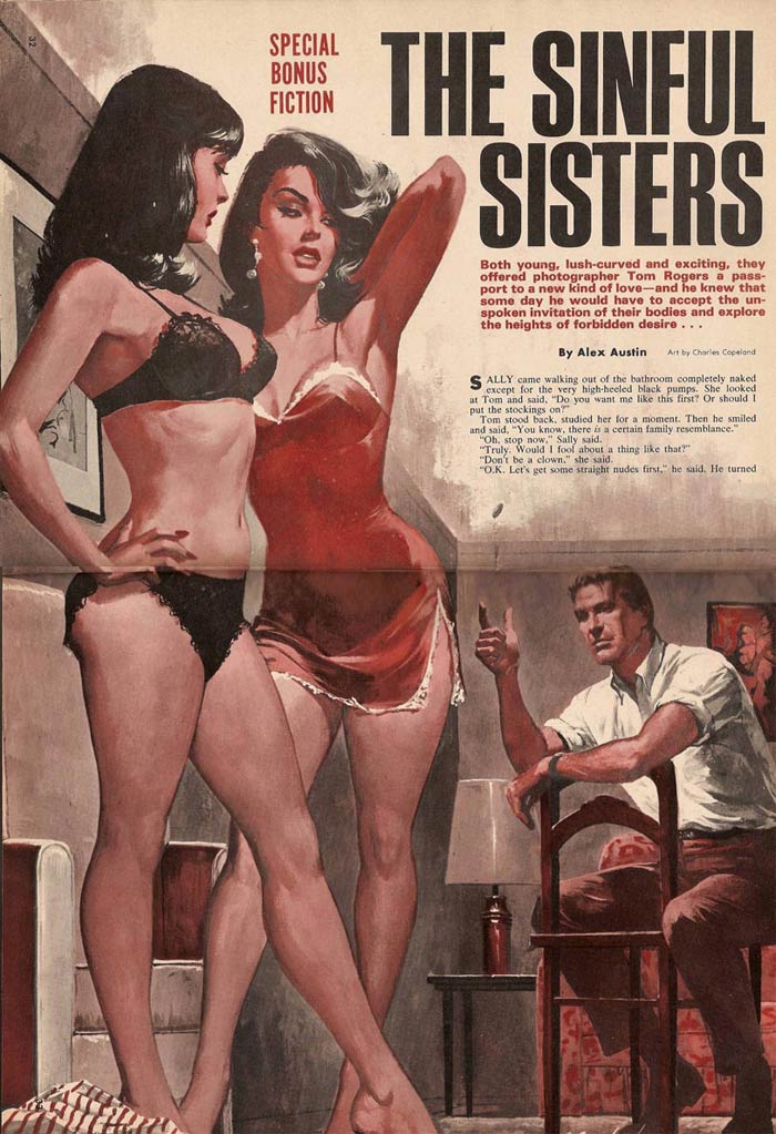 April 1969 - "The Blonde Swinger Next Door". Copeland's b&w redraws his color painting for STAG December 1966, changing her hair color to match the title. |