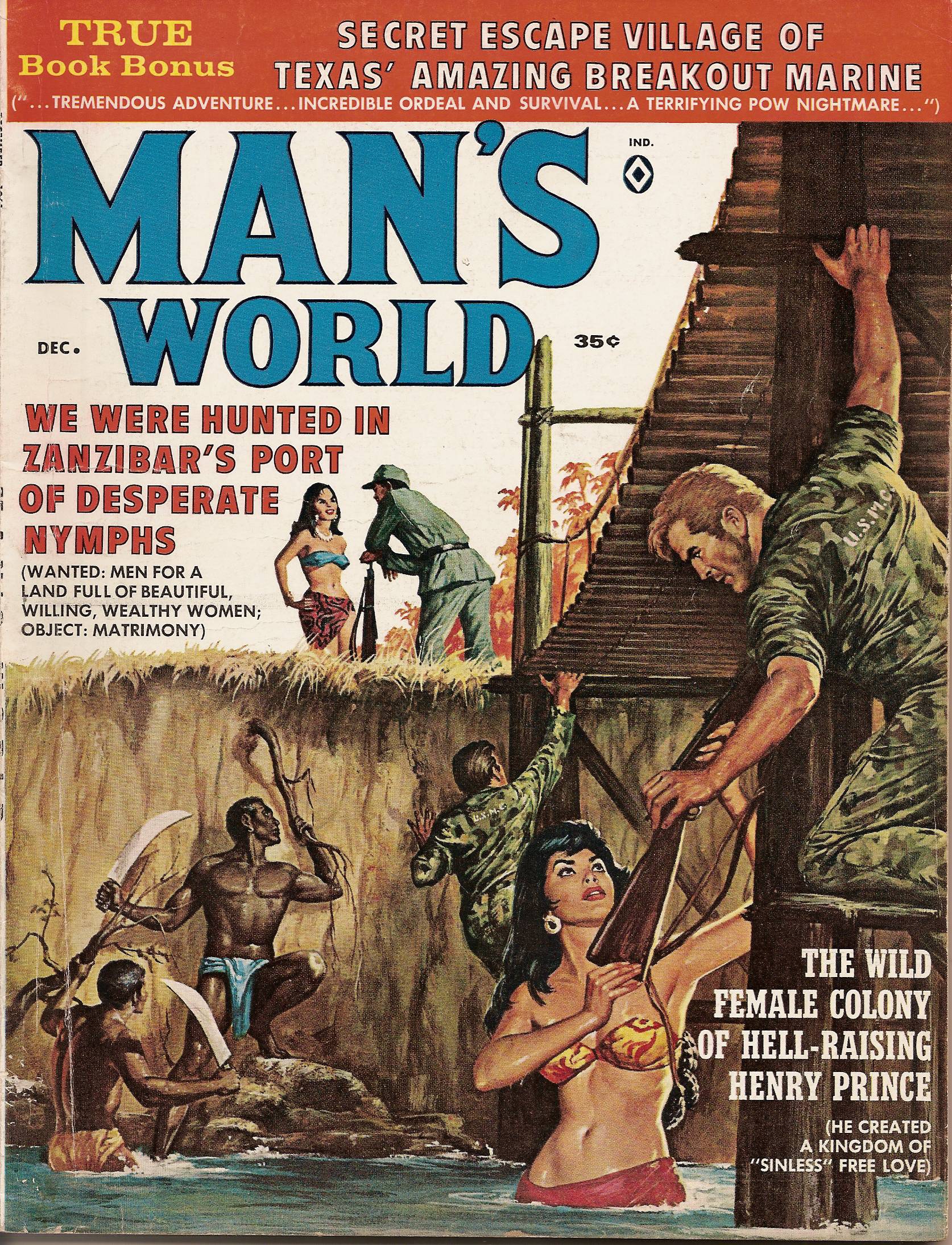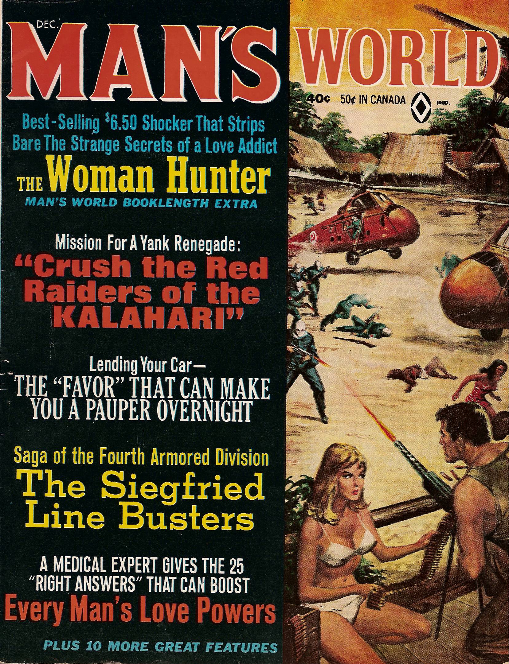 We learn from DEVINE'S GUIDE TO MEN'S ADVENTURE MAGAZINES that the first three issues of MAN'S WORLD were called MEN IN ACTION. The title changed with Vol 1, No 4 in November of 1955, and Charles Copeland came onboard as a regular contributor for editor Noah Sarlat in February 1958. He often did at least one cover a year in addition to his interior work. MAN'S WORLD was a bimonthly, published in the even-numbered months Feb Apr June Aug Oct & Dec. Devine describes this magazine well when he says: “Great cover paintings of men in danger, wild animals, military scenes”. Like all men's adventure magazines it changed over the years. When Bruce Jay Friedman became editor in 1964, the cover art got smaller but MAN'S WORLD became more of a modern “men's magazine”, with “Girl in a Man's World” pin-up photography. MAN'S WORLD was published under several names – Medallion, Official Magazines, Olympia, Vista, etc – but they were all various identities of Magazine Management, Goodman's Diamond Group. Later on, photo covers - and photo-illustrated stories - took over in the 1970s, but in its heyday MAN'S WORLD was the real thing. |
