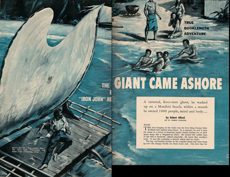 October 1958 - "Those Girls From Greenwich Village". Not typical men's adventure fare. Almost everybody is paired off in this fun SWANK-style party scene; including the first depiction of a lesbian couple I ever remember seeing in the pages of MEN. |