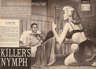 April 1965 - title page & second-page illustration for "Killer's Nymph" (READY FOR THE TIGER) by Sam Ross. Later small drawings are by a different artist.