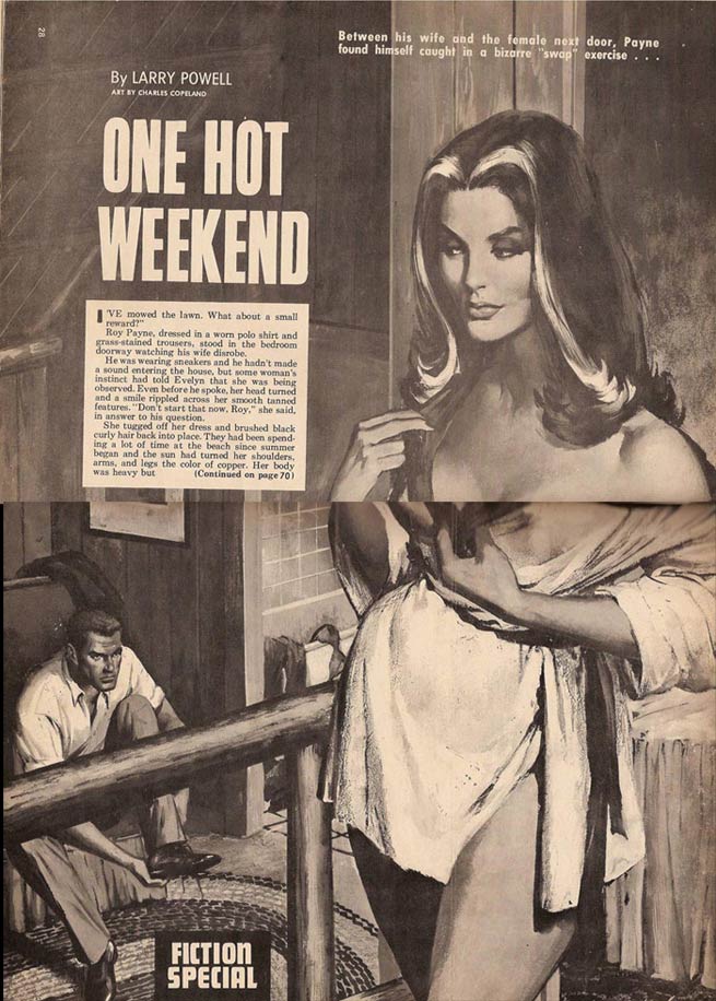 November 1968 - "One Hot Weekend". This b&w 2-pager reuses color art from STAG November 1965, where it was used to illustrate a different story