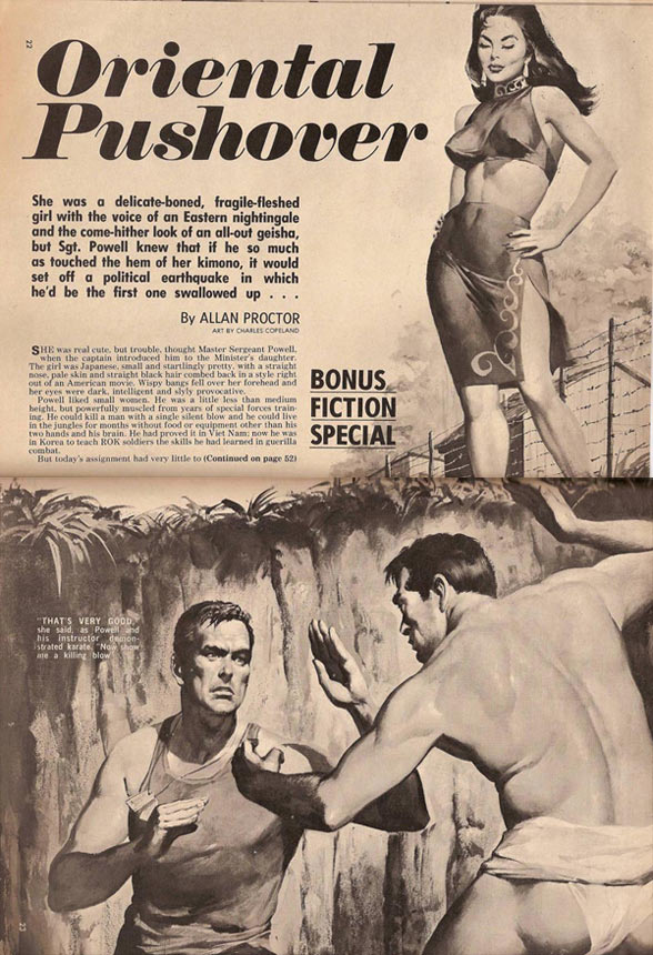 In the mid-1960s MEN gave us a top-notch series of issues from the unbeatable team of editor B.J. Friedman, associate editors Mario Puzo et al, and art director Larry Graber. They lined up writers like James M. Cain and Richard S. Prather, and they used Copeland in almost every issue of that period. MEN ANNUAL #1 and #2 both feature Pussycat comic strips by Bill Ward.