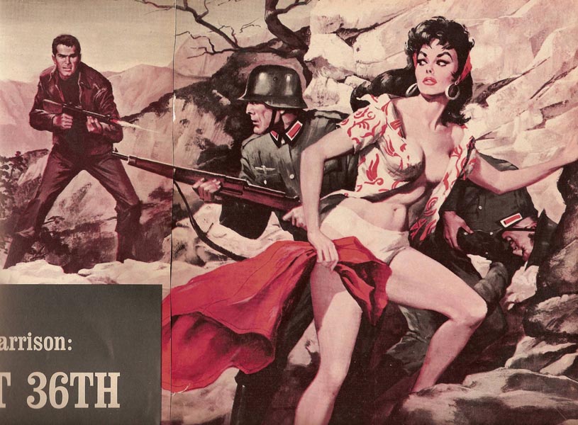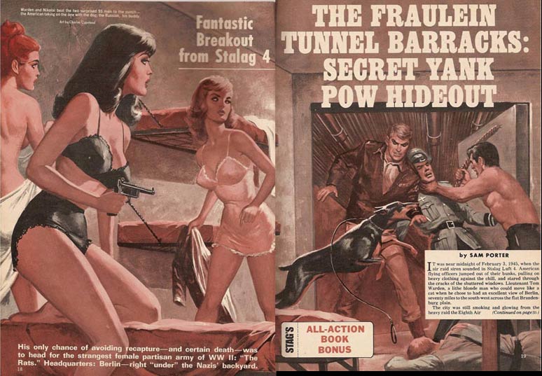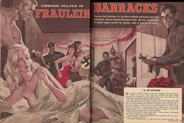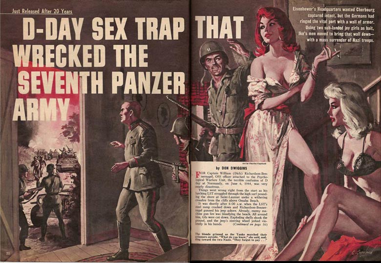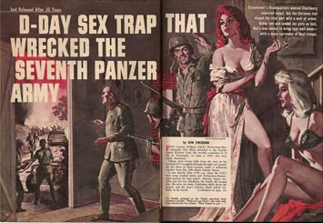 | June 1964 - "D-Day Sex Trap That Wrecked the Seventh Panzer Army". Europe in 1944 - much better use of Nazis. Not true ("just released after 20 years") but more appropriate than concentration camp references in dating tips. |