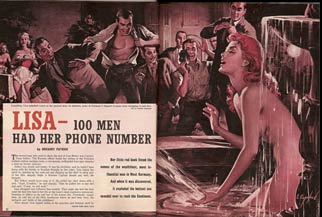 | December 1962 - "Lisa - 100 Men Had Her Phone Number"- reprinted in b&w in COMPLETE MAN Feb 1965. |