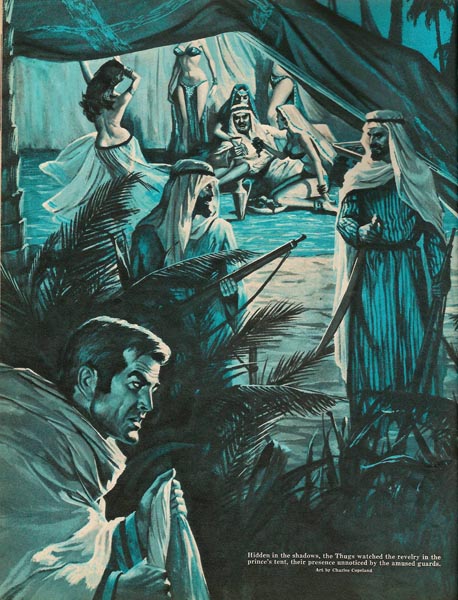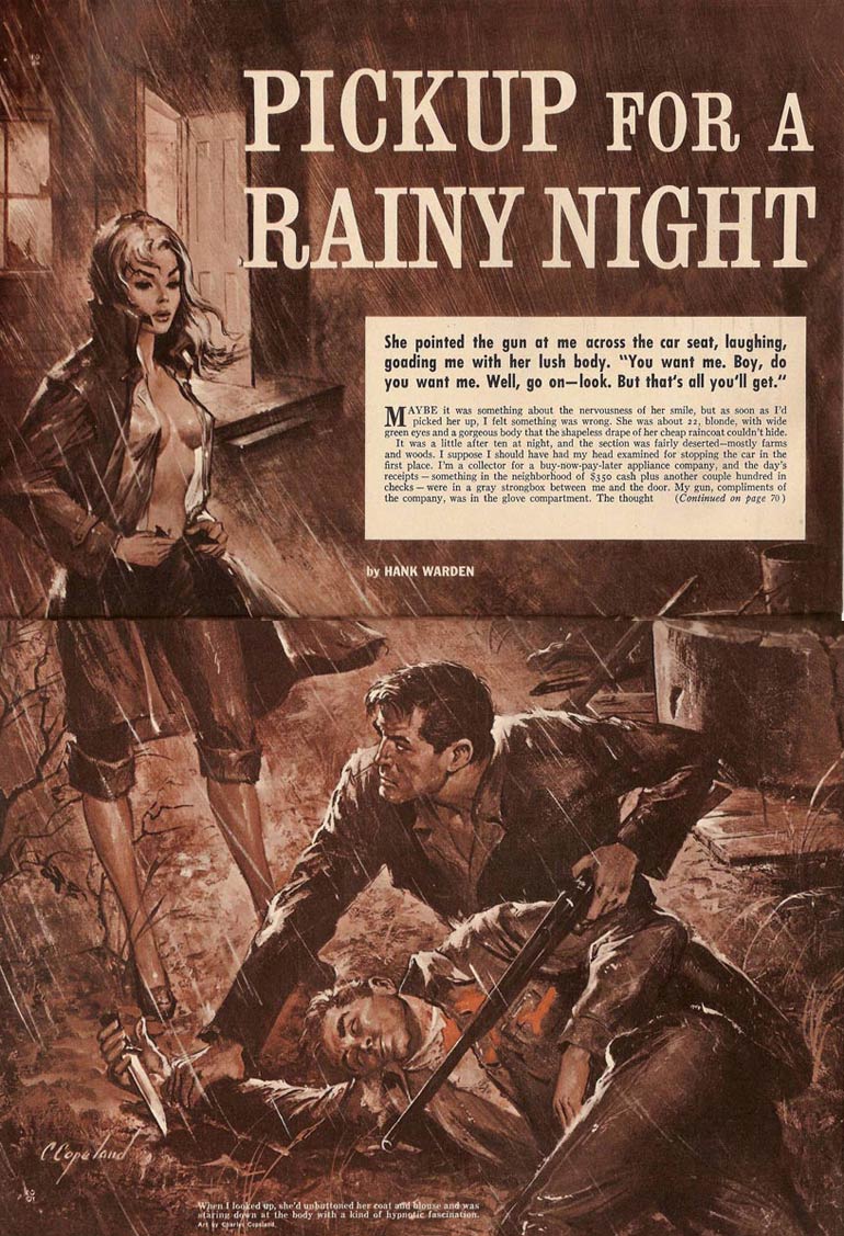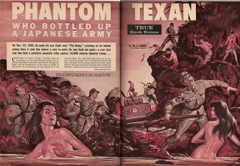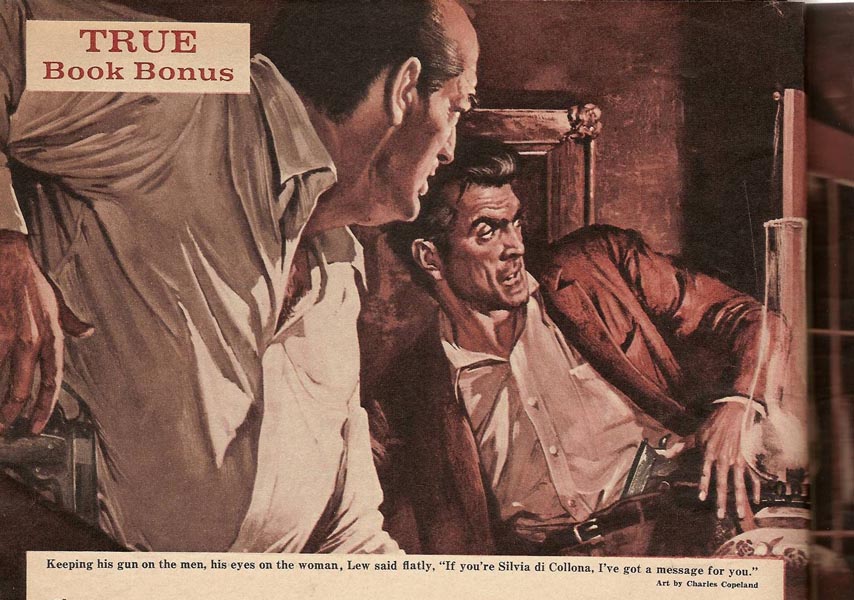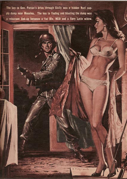 | .April 1966 - two illustrations: "The Girl Who Taught Love" "art by Charles Copeland", signed 'C. Copeland' (reused in the Jan 1968 issue of TRUE ACTION, the guy in that story is not in the Army so there's no stripe on his sleeve); and.Copeland's second April 1966 appearance is "Vicious Red Plot to Auction Human Hostages", "art by C. Wesley", signed 'Wesley' (his middle name). |