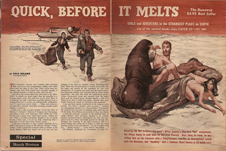 | July 1964 - book bonus "Quick, Before It Melts" by Philip Benjamin. (Later small illustrations for this book bonus are by an uncredited staff artist.) Although best known for his human beings, I think Copeland's animals are awesome. But people always ask what kind of animal this one is supposed to be - it's a seal. |
