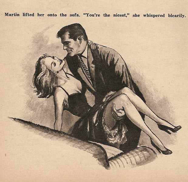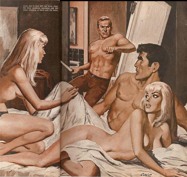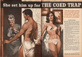 | August 1965 - "The Coed Trap" - art is redrawn for the 1968 MALE ANNUAL, where the man is a blonde and the pictures on the wall behind the woman change. |