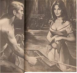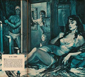 | July 1957 - "Man-Hungry Huntress" by William Woolfolk. Two-page duotone (shown in our Paperback Covers section with Berkley G199) and seven small b&w illustrations, two shown here: |