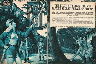 | June 1960 - "The Pilot Who Crashed Into Japan's Secret Female Garrison" reused in MALE ANNUAL #1, 1963. |