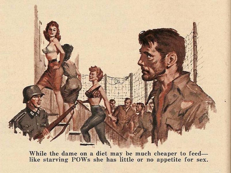 Detail of May 1964 article. Do starving POWs and Nazis have anything to do with 1964 dating tips? Only in STAG. |