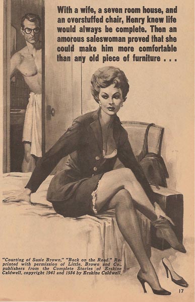 - two uncredited b&w illustrations for two stories by Erskine Caldwell: "The Seduction of Emily Brown" & "The Seduction of Mr. Sears". |