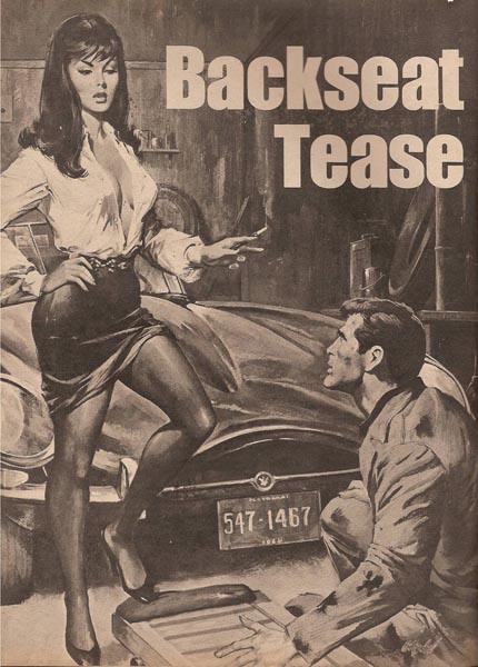 3. "Backseat Tease" "art by Barry Charles" reuses MALE Nov 1965 art with Copeland's signature visibly rubbed out in lower right corner. |