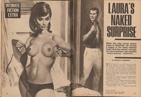 | August 1971 - "Laura's Naked Surprise" (not to be confused with different story of the same name in FOR MEN ONLY Sept 1968 reprinted in TRUE ACTION Oct 1970) redraws art from STAG Oct 1966, now topless.