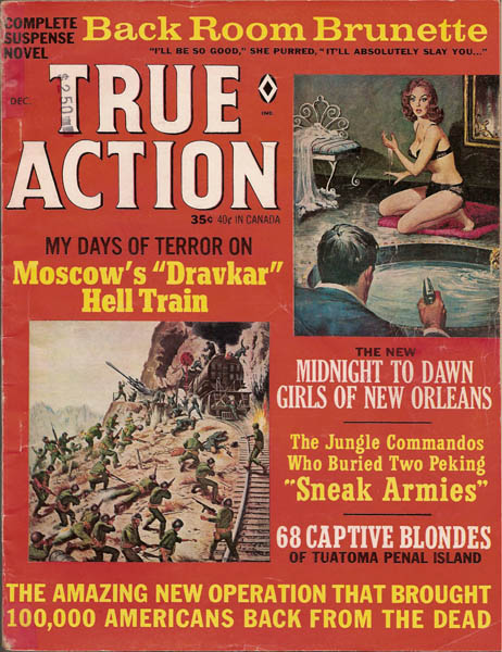 In EVEN THE RHINOS WERE NYMPHOS, TRUE ACTION's editor Bruce Jay Friedman tells us about his boss Martin Goodman. "A genius at divining the buying habits of magazine shoppers, he had great faith in the pulling power of key words". The exception, Friedman thought, was TRUE ACTION, which "seemed to represent a ringing rebuke to a (non-existent) magazine called FALSE ACTION." A bi-monthly, TRUE ACTION presented some awesome issues early on, and then gradually became a reprint magazine.